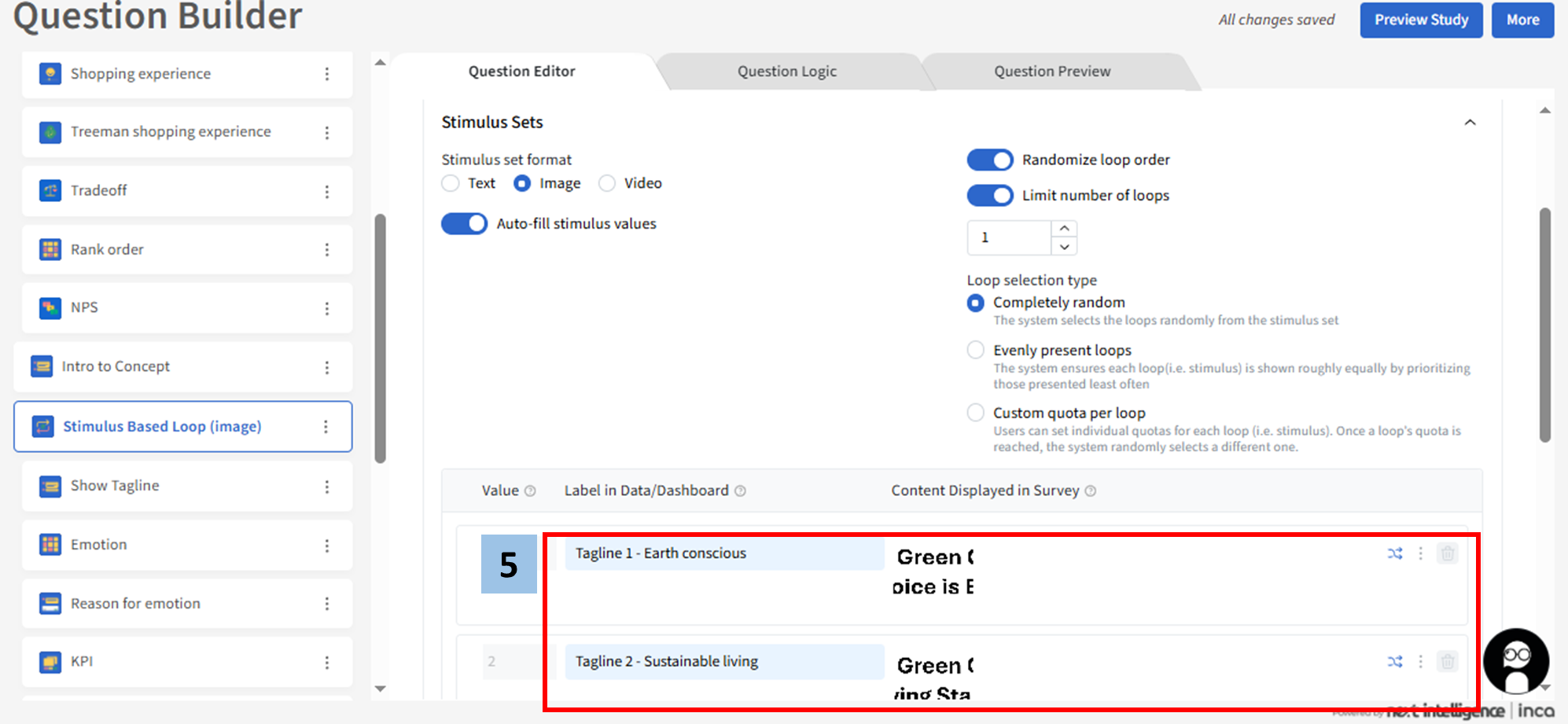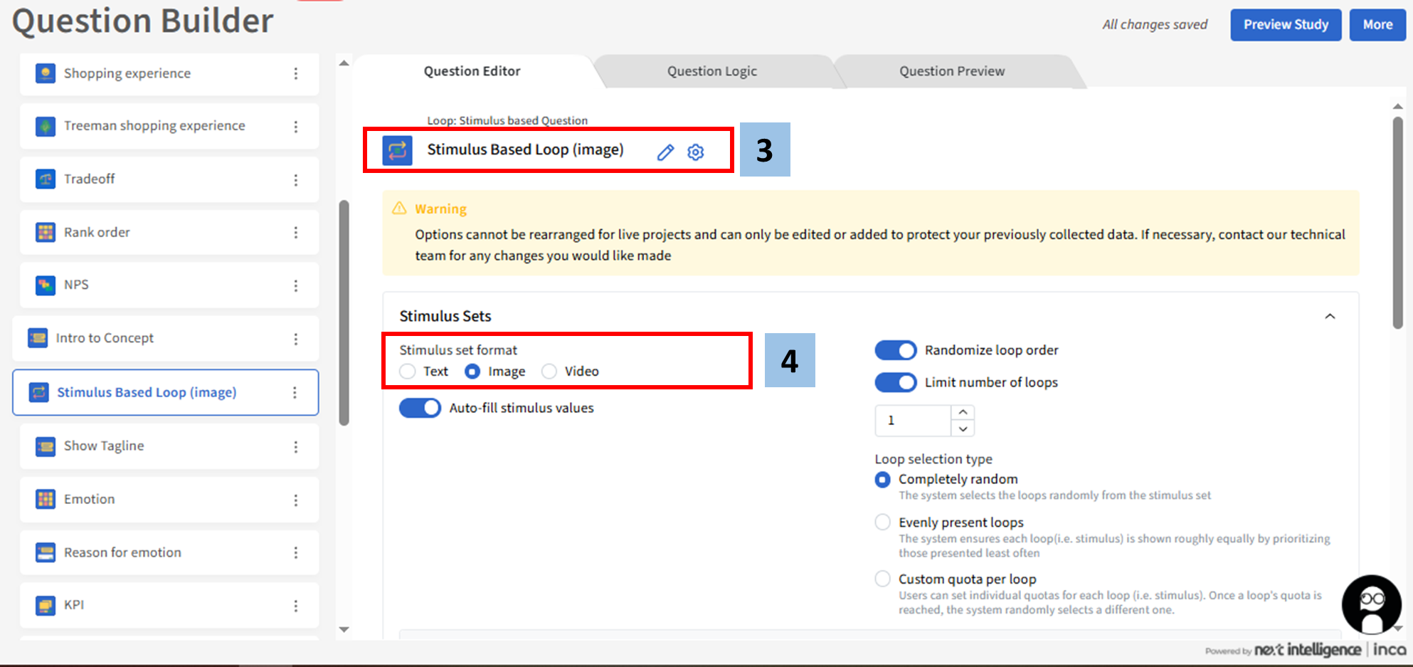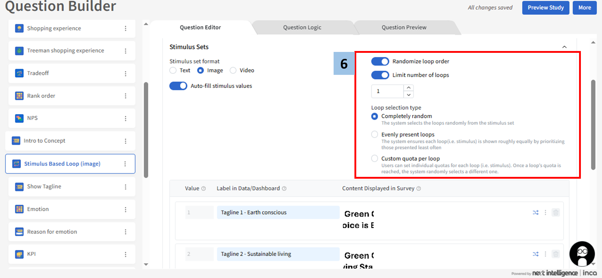 - 6.1. Randomize Loop Order: Users can choose whether to randomize the order in which the loop runs. If enabled, the system will present the looped questions in a random order based on the stimulus set. By default, this option should be checked. If it's not enabled, the loop order will follow the stimulus values from smallest to largest.