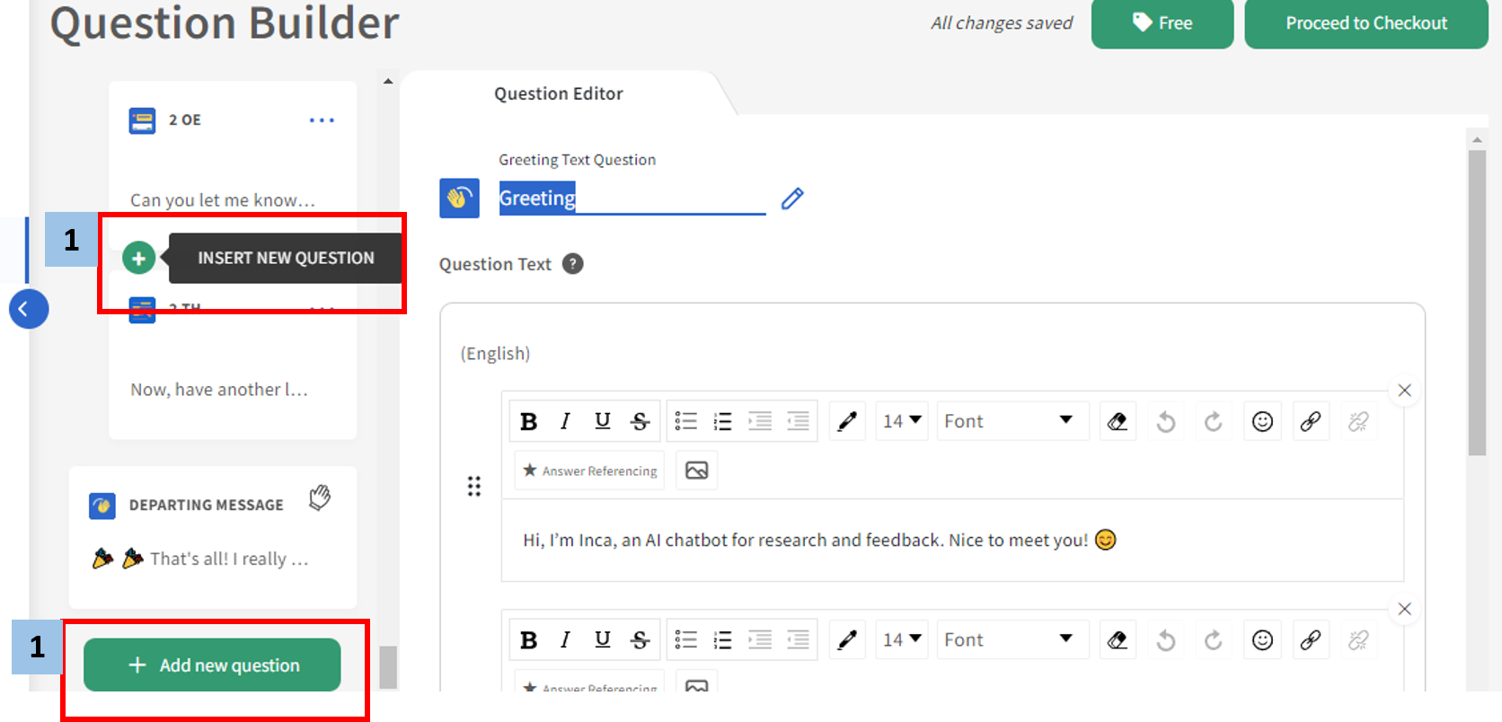 1. In the Questionnaire Builder page, add a new question OR insert a new question by hovering over an existing question and clicking the green (+) button (either above or below the existing question)