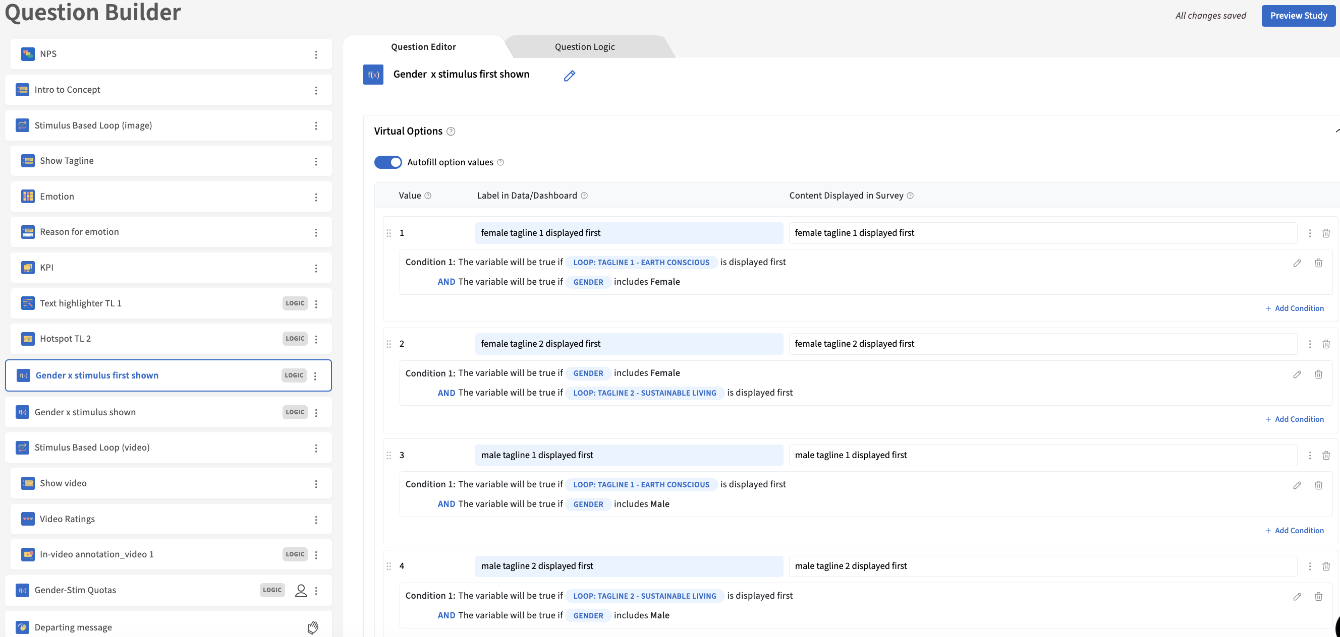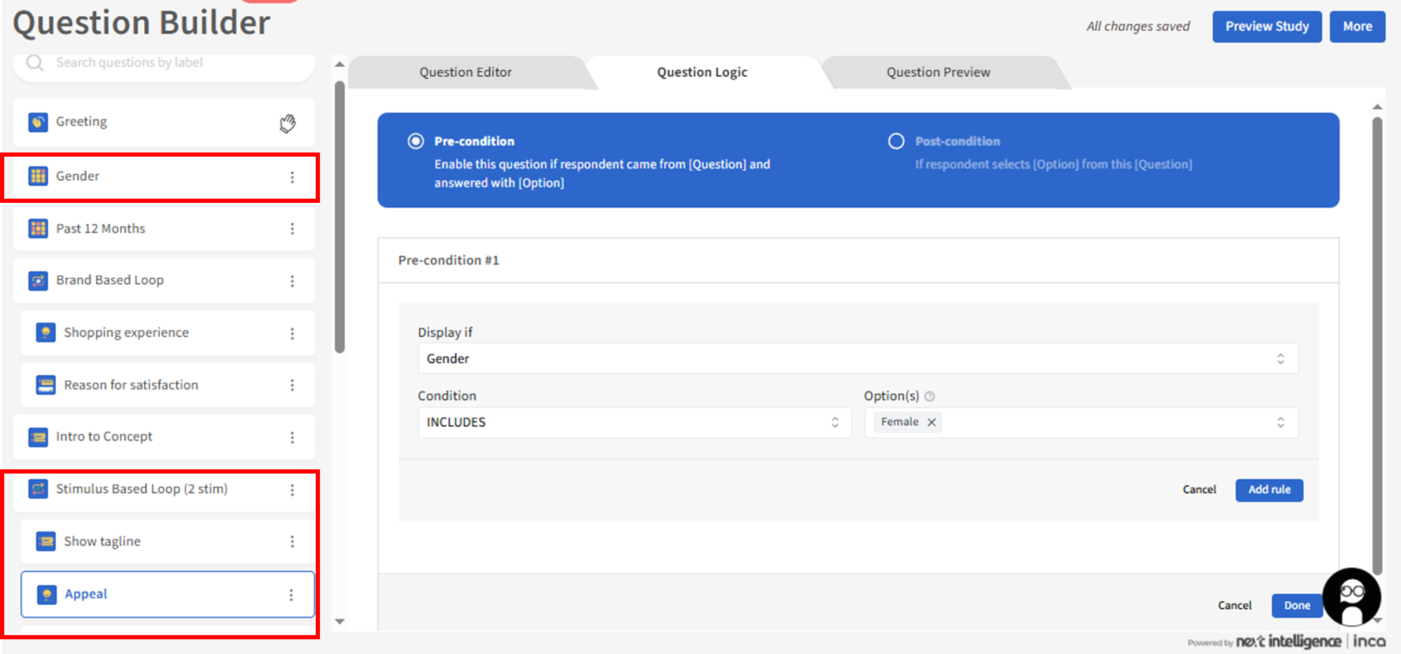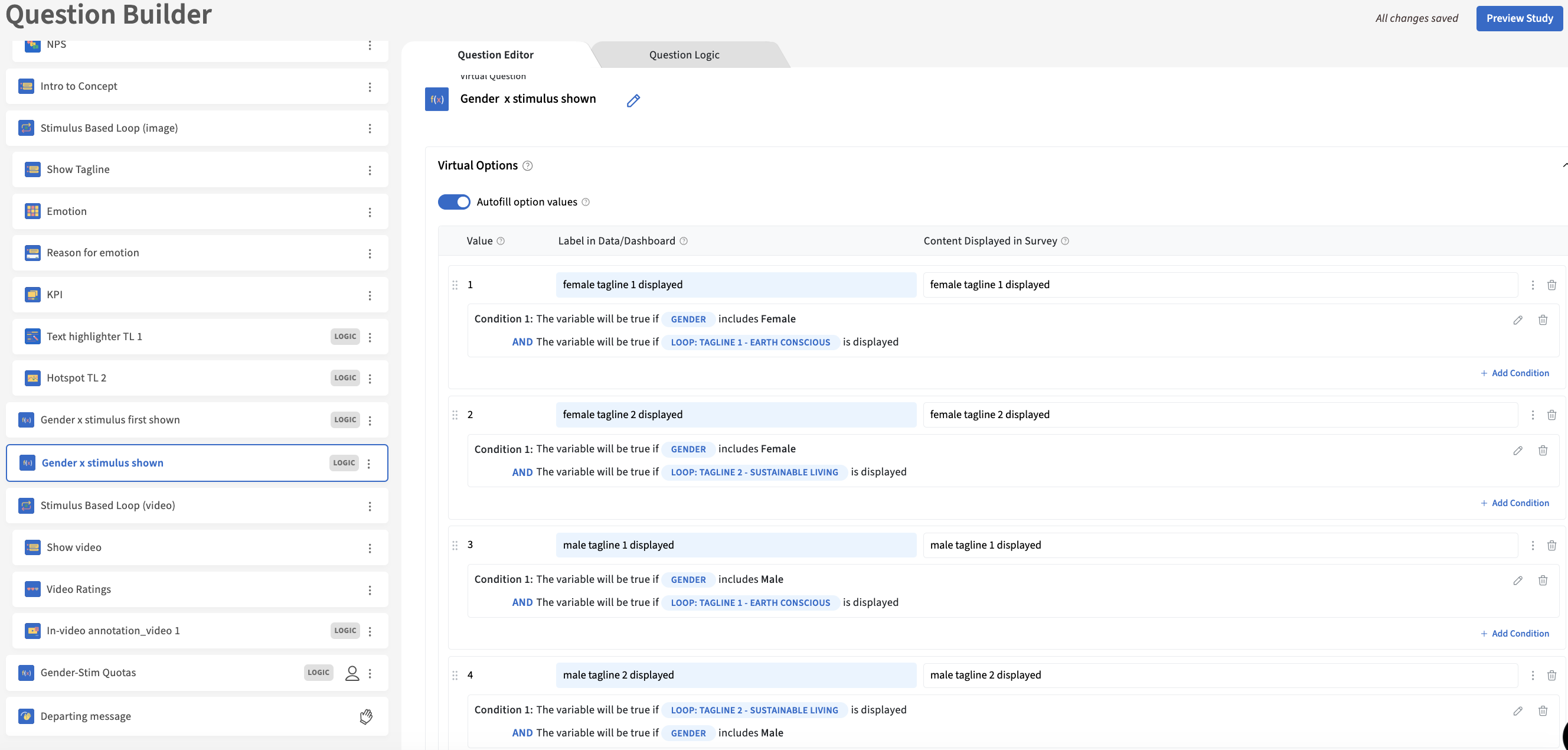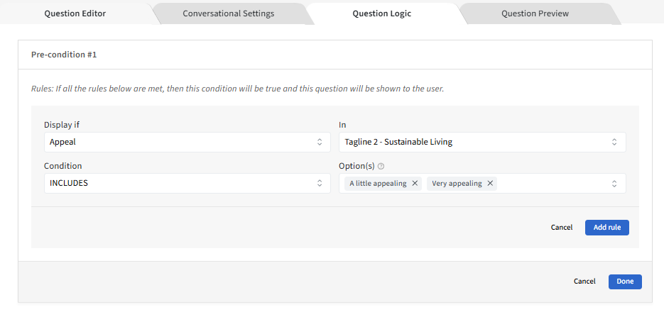 For example: You are asking people "Do you find tagline appealing?" (Appeal) only among Females. In this case, you can select the question outside of the loop (Gender) and use condition Include and select option Female