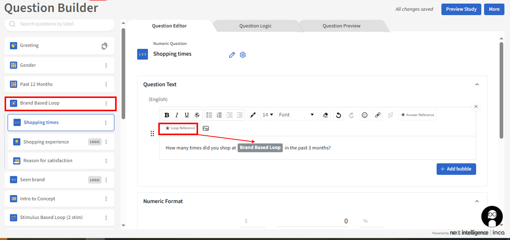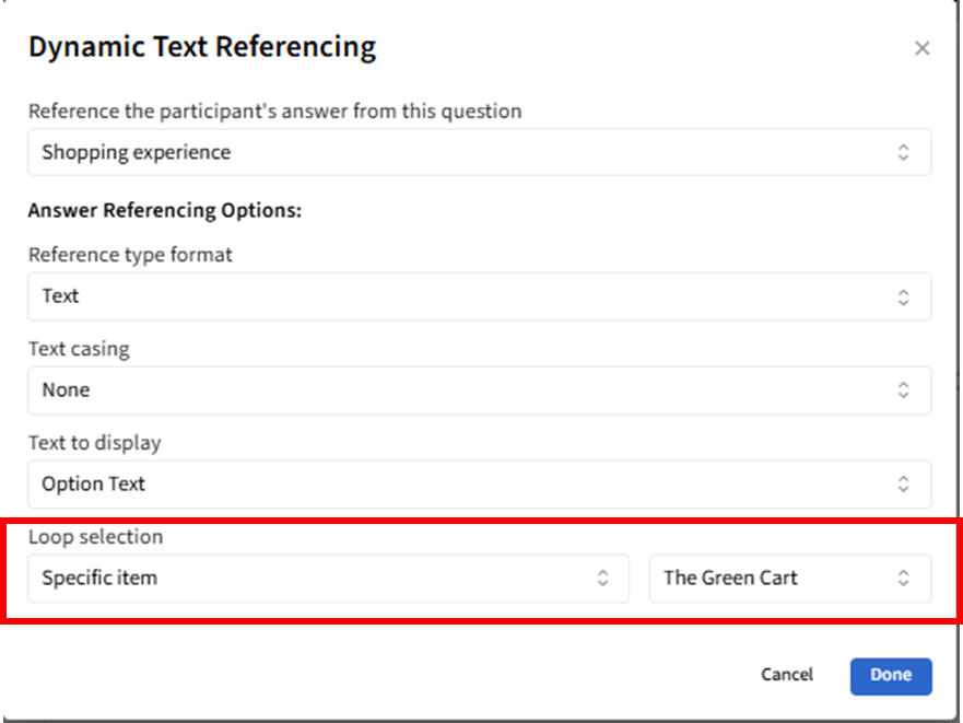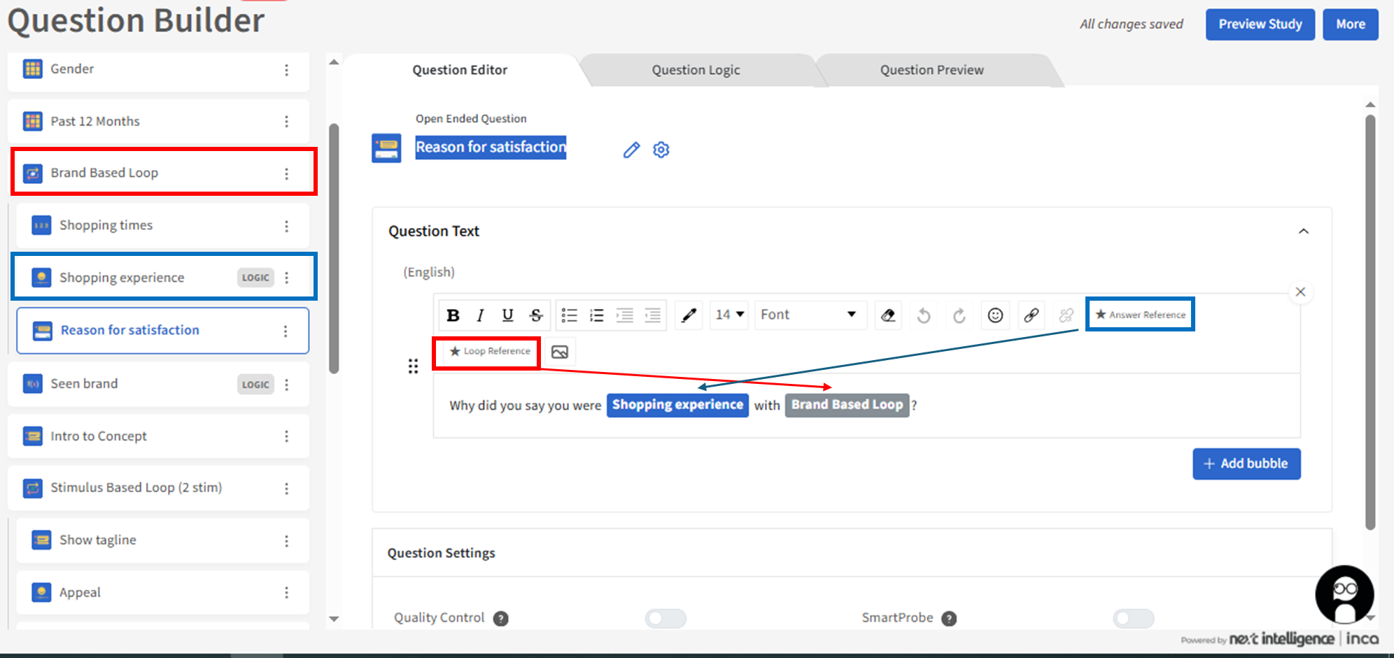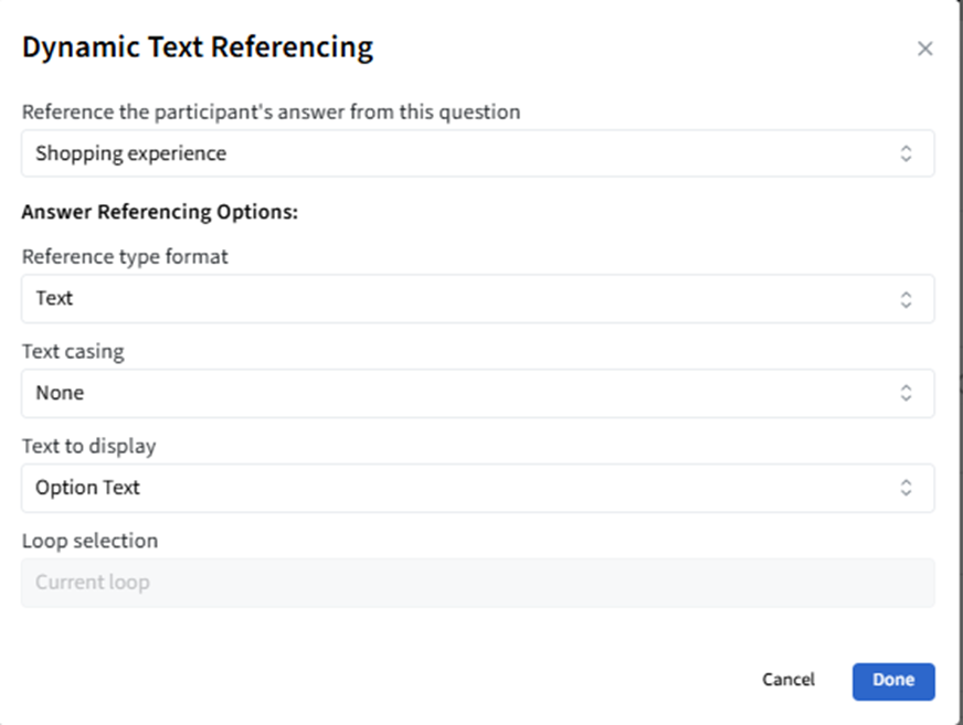 9. When creating new questions and you want pipe in the answer in the loop reference question (i.e. brand selected) in the Question Text, simply use the Loop Reference. This will reference each of the current loop the participant is in.