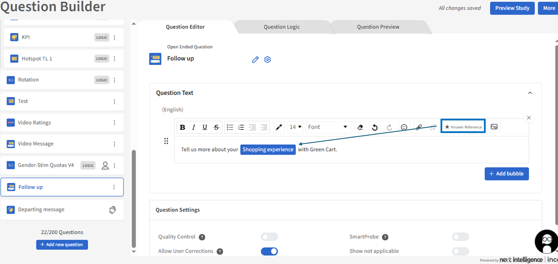4. In the Question Settings, select a reference question that the loop will be based on. This must be either a multiple-choice type question, such as standard multiple choice, rank order, virtual questions, hot air balloon, rapid choice, etc. or an open ended question with multiple targets.