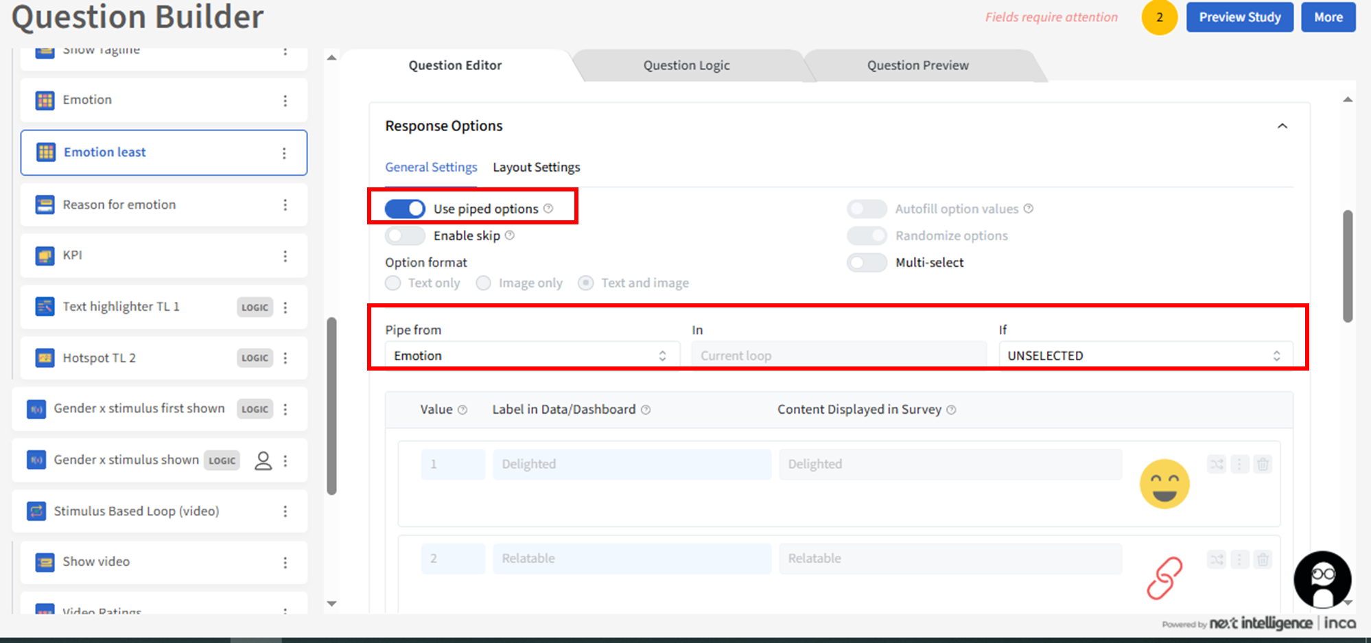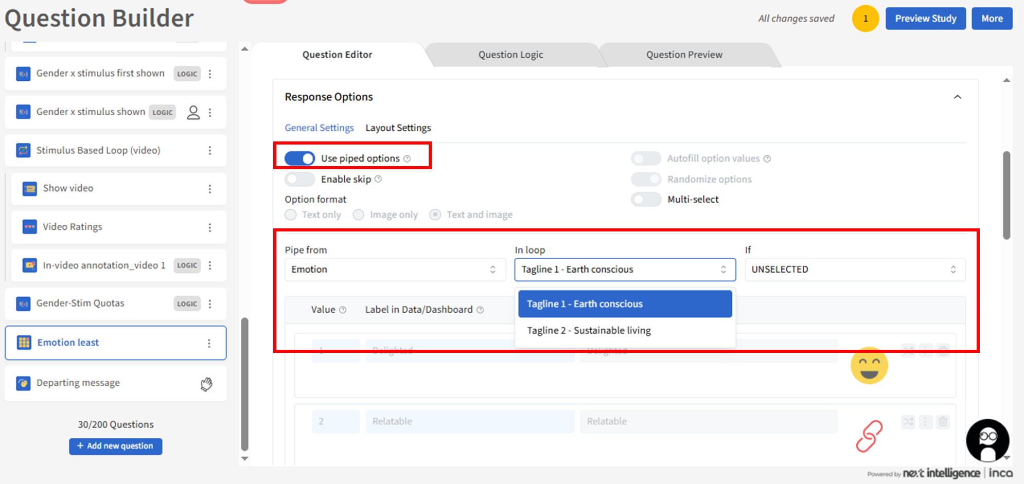 Another appeal of the loop question is that during analysis we can easily merge or stack the data together and compare results across different stimuli or previous selections, as we have packed the same set of questions together in the question builder.