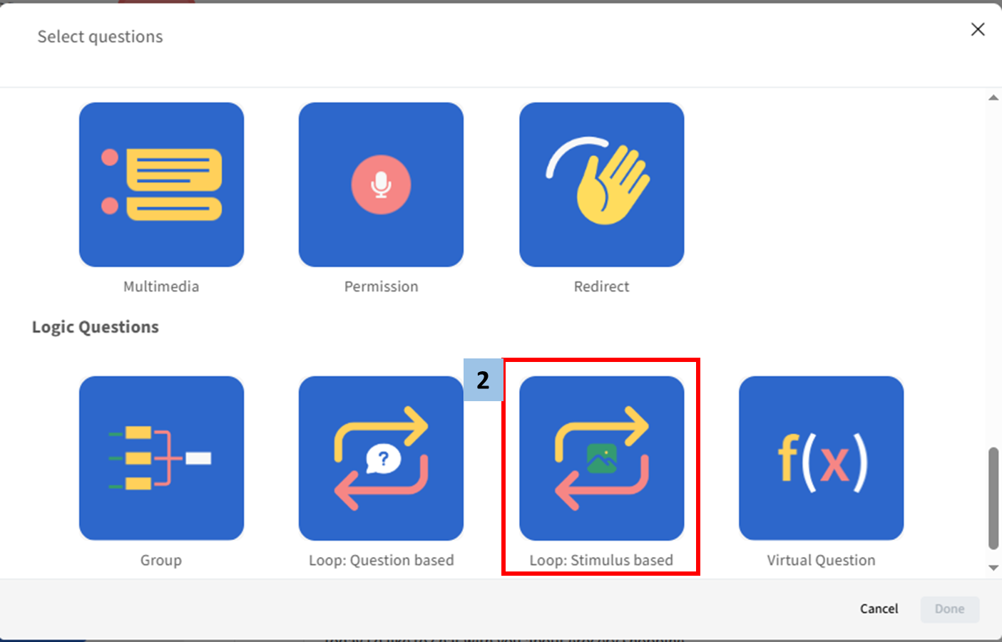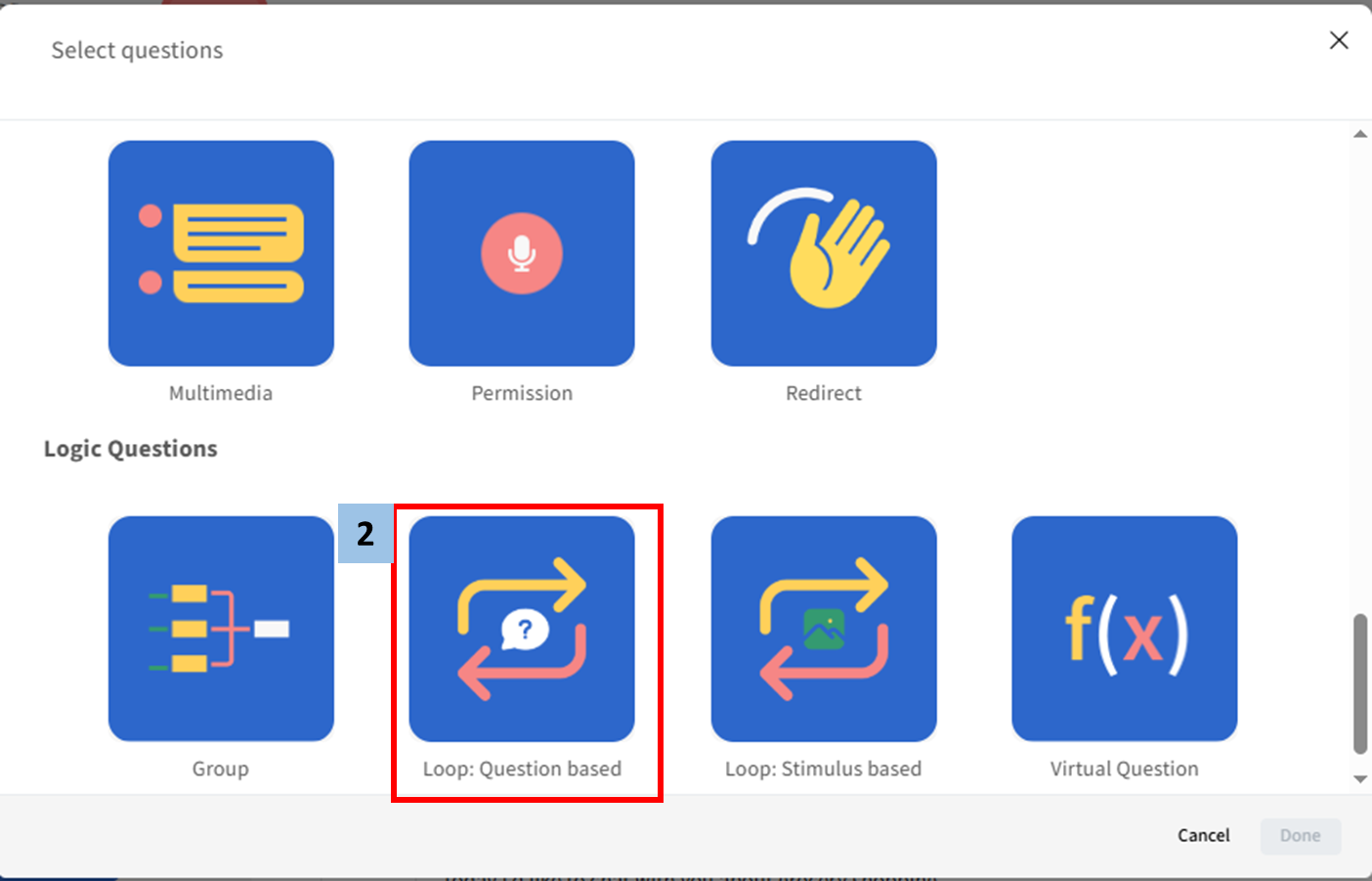 8. Select all questions that will be included into this Loop. Users can either create new questions within the loop or add existing ones. Users can add any question types in the loop except for the loop question type, basically we do not support loop within loop.