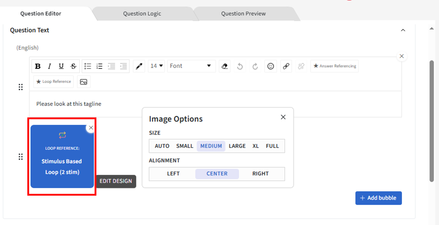 For Image formats, users can edit the size and alignment of the stimulus by hovering to the Loop reference (blue box) then click Edit Design. Users can see select the image size they prefer but we suggest to use Full for maximum size.