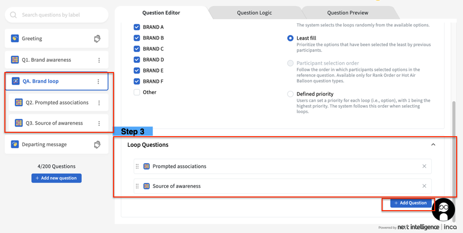 2. Add the Loop Question based question. In this case, we are only asking the follow-up questions for two brands that the participant is aware of, and the basis of the brand being asked in the Loop will be least fill method. (Follow the instructions as per the steps: How to set up the Loop: Question based)