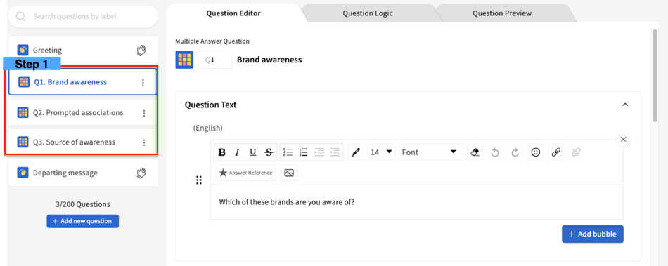 1. Prepare your reference question (i.e. Brand Awareness) and follow-up questions to be asked in a Loop (i.e. Prompted Associations, Source of Awareness)