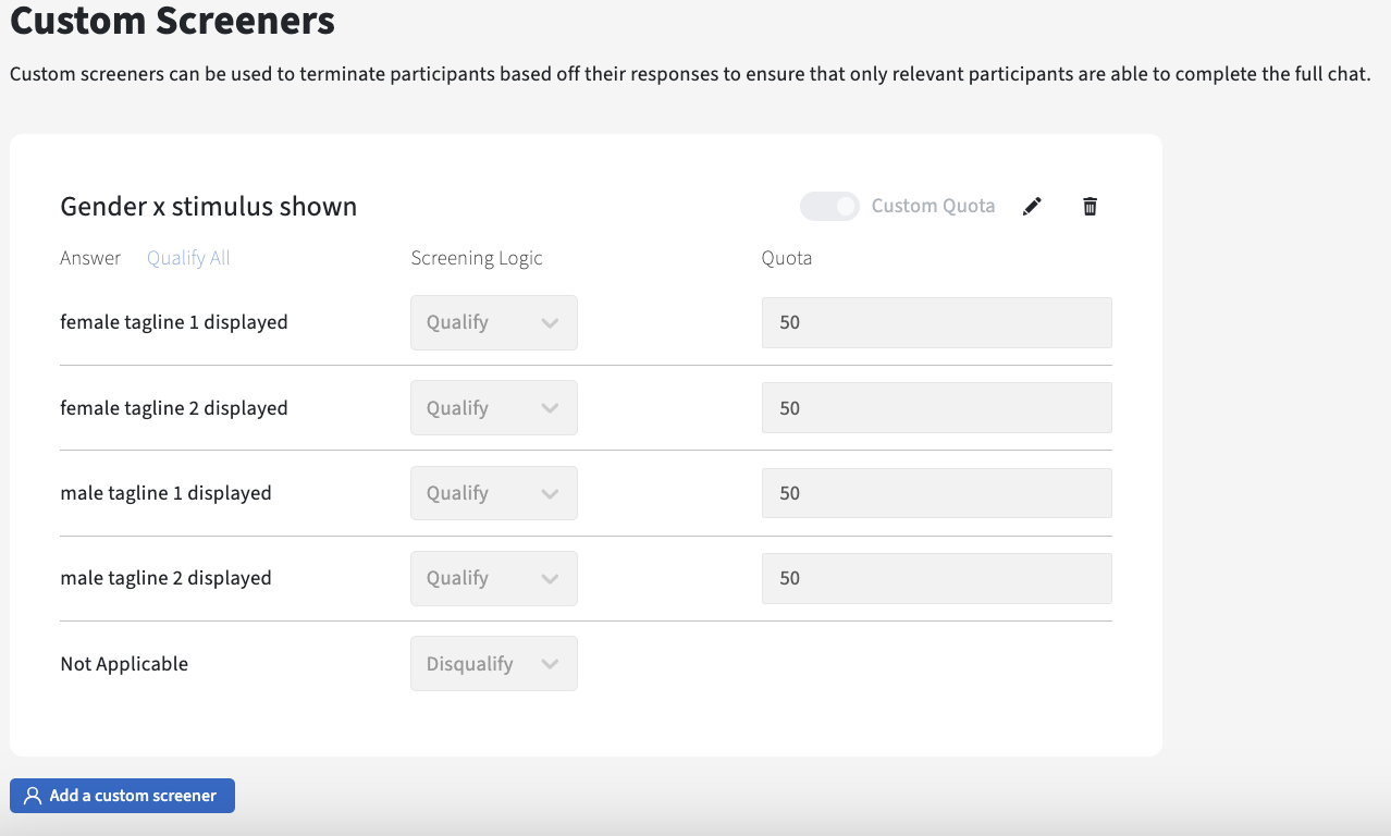Then add the Virtual Question as a Custom Screener in the Audience page. Once the the Virtual Question is added, you can add the quota numbers for each group.