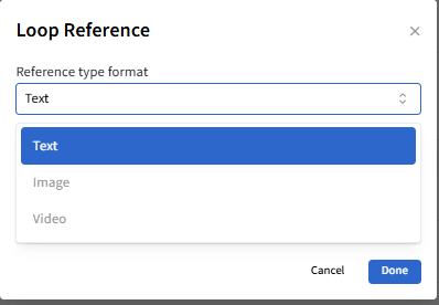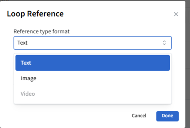 In the Loop Reference, users must select again the format of the stimulus (Text, Image or Video) to be exposed in the drop down for Reference type format