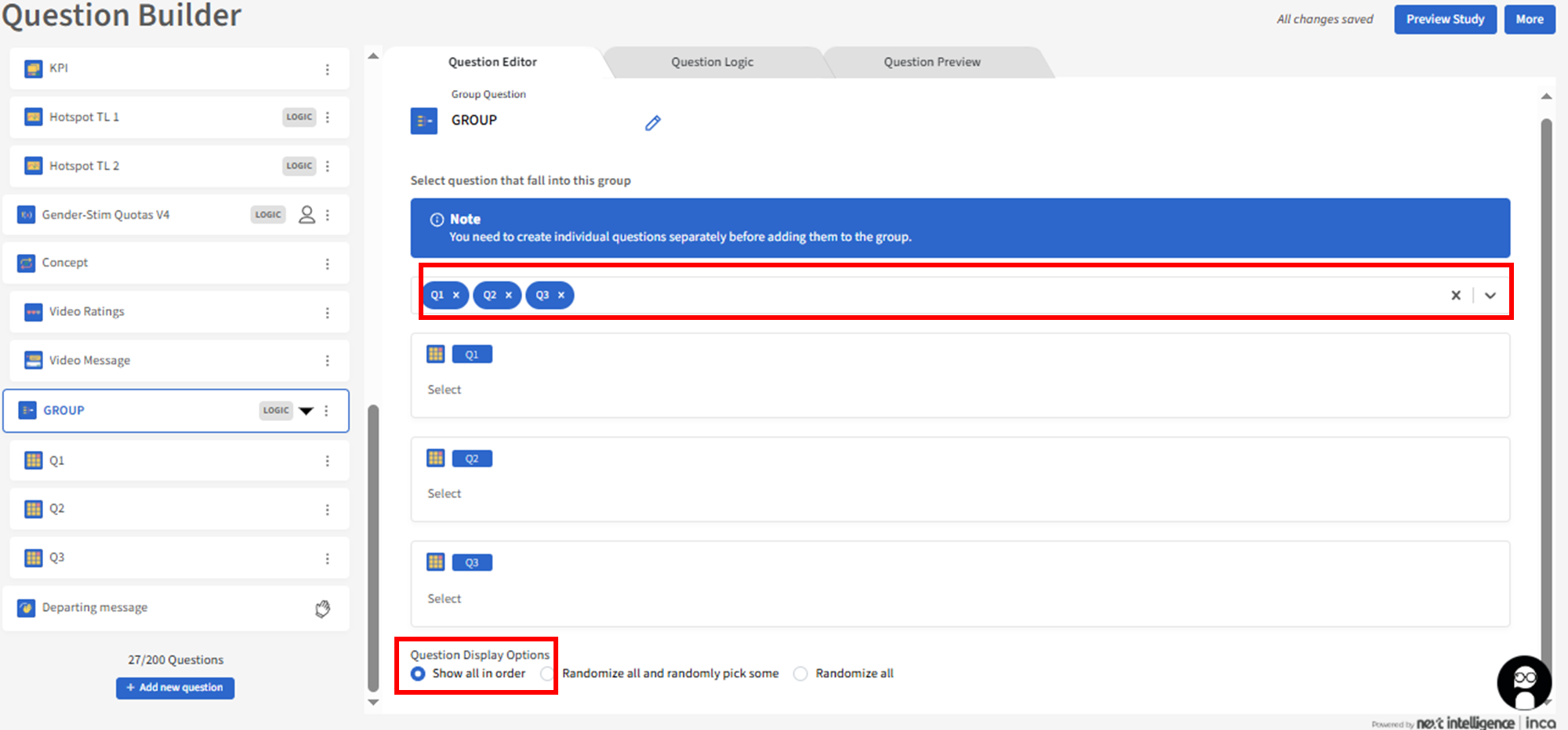 All the questions inside the Group will be shown in a chronological order. When users require only a certain portion of participants to answer sub-questions, then users can use a Group question instead of a Loop question.