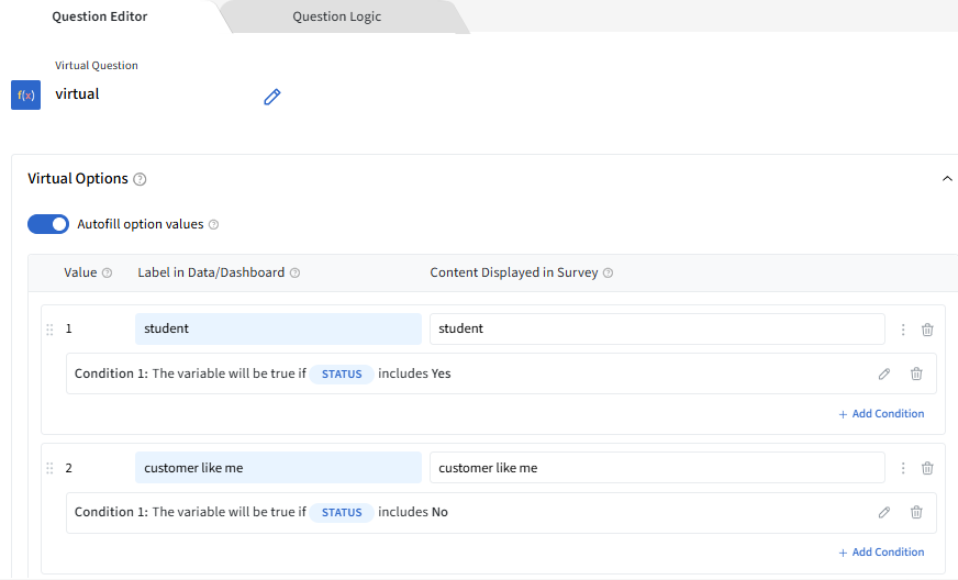 In this case, we would first create a Virtual Question with 2 variables - the first writing "student" in the Display Text and defining the logics that they are students, the second writing "customers like me" in the Display Text and defining the logics that they are NOT students.