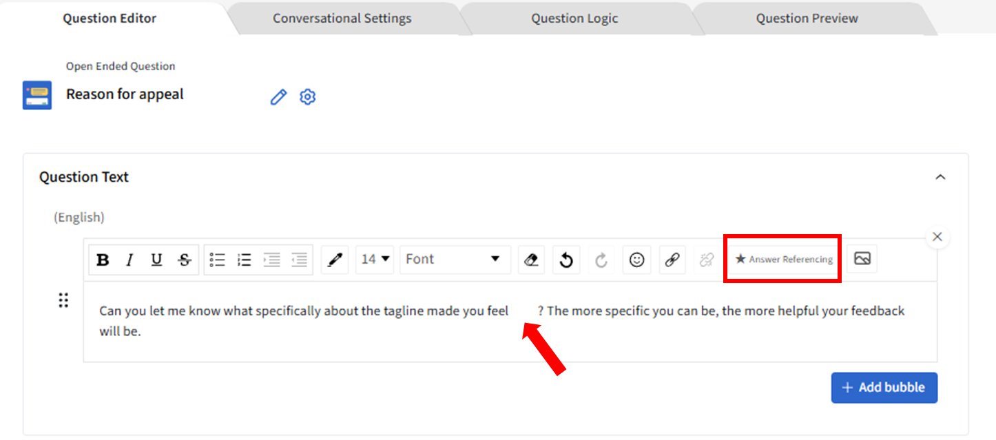 1. In your question text box, move the cursor to where you want to insert the wording/answer in the previous question and then click Answer Referencing.