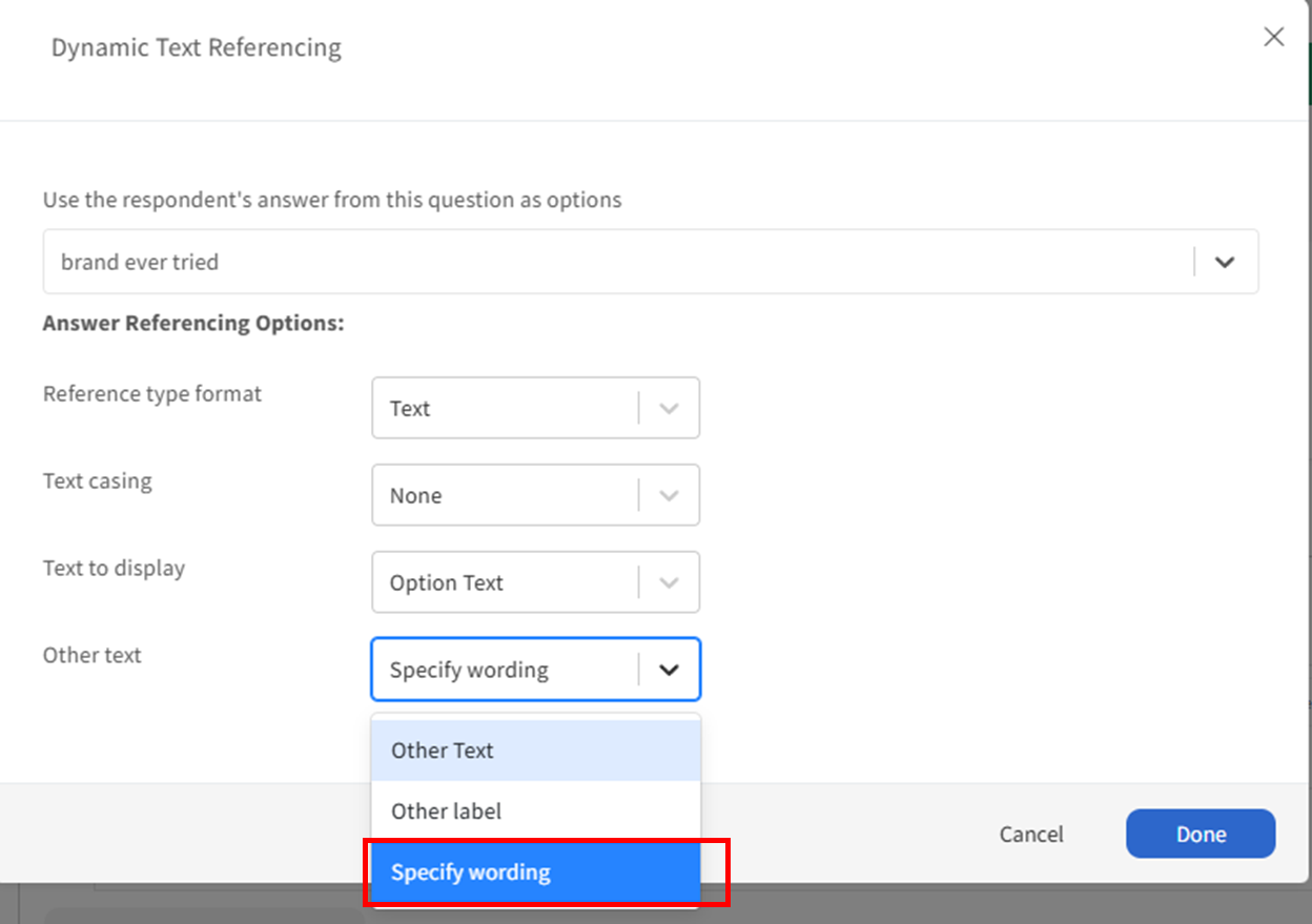 When you want to pipe in an answer option for "Others (specify)" and you want to show the exact response in the chatbot (instead of "Others" text), you can change this in the "Other text" drop down and select "Specify Wording".
