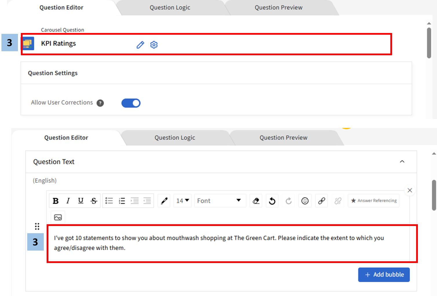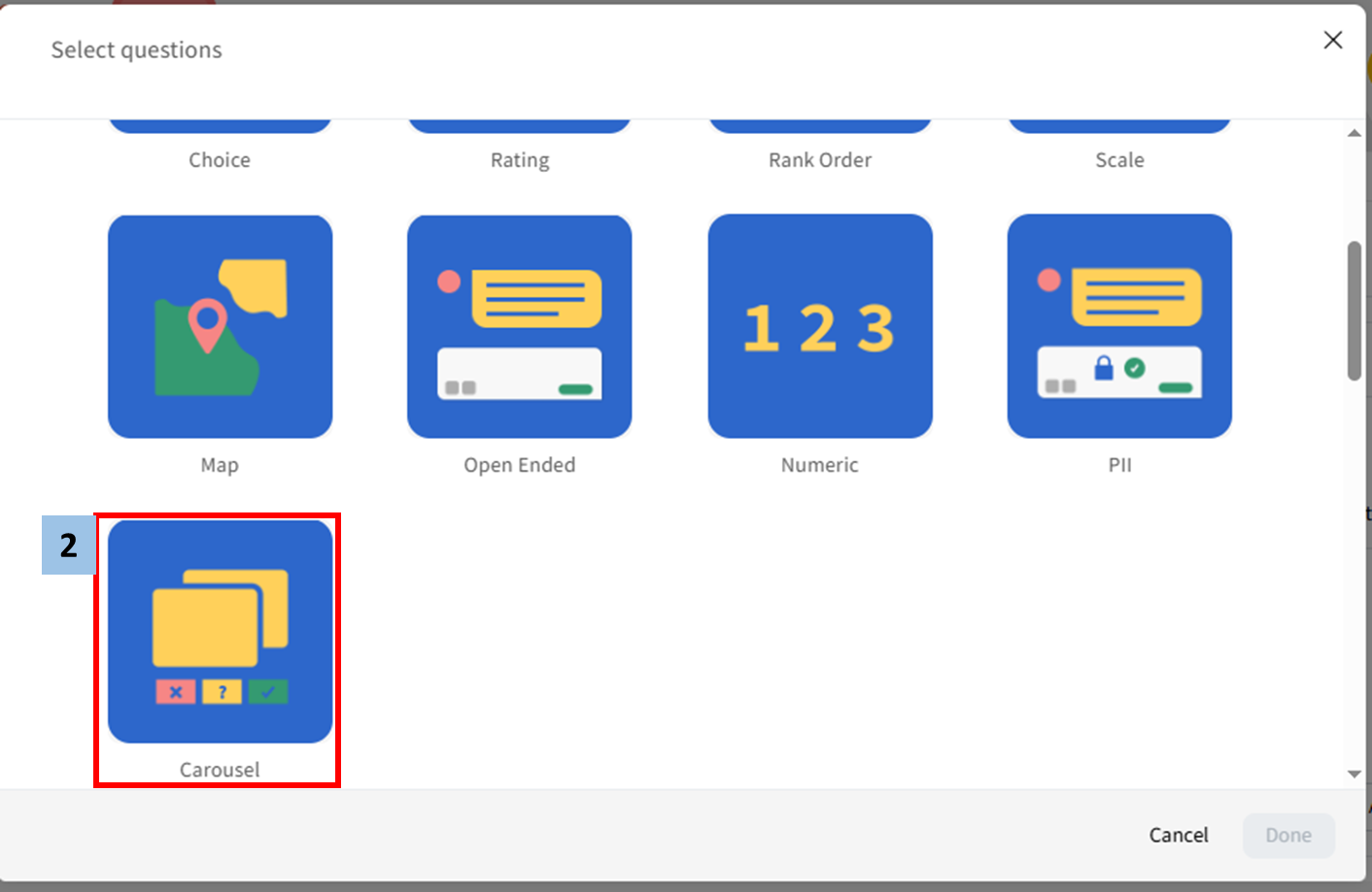An improvement on traditional Grid questions, Carousel Questions are used when you need to ask several related questions with the same response sets. With a Carousel setting, you present the participant with a series of pop-up cards of items to be tested (e.g. brand image attributes), sharing a common set of response options. Because Carousel group questions logically, they can clue in participants that you’re asking them to share opinions from a similar mindset and go through them fairly quickly.