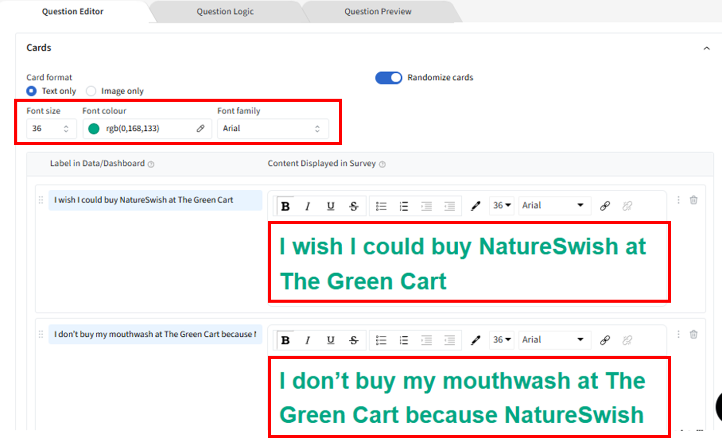 - Users can modify the text size, color and font type for 'Text only' cards. This will be applicable for all cards instead of individual cards.