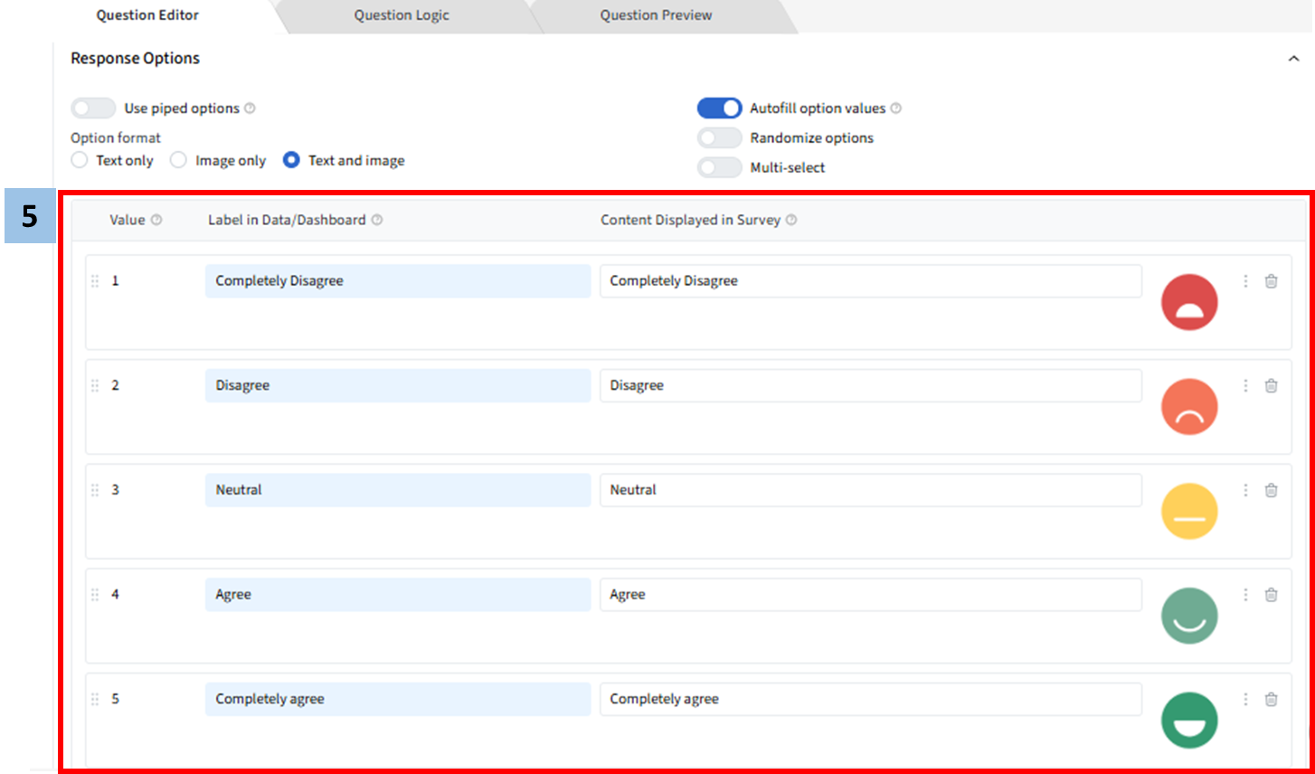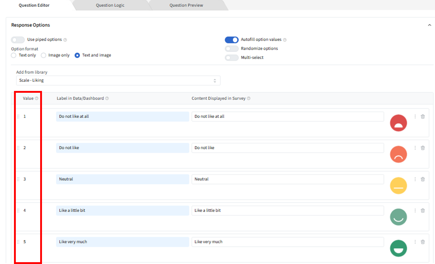 - If disabled, this will allow users to change the code value. For example, in your 5-pt scale rating instead of "Code 5" = Like very much, users can manually change or reverse the code value like "Code 1" = Like very much