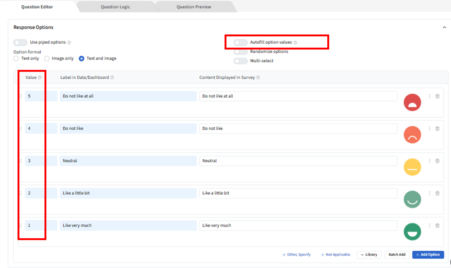 - When adding Options (whether individually, batch add or from Library) , the Value or option codes as well as the Label (what appears in result visualization or dashboard) will also be automatically updated, but can also be modified by users.