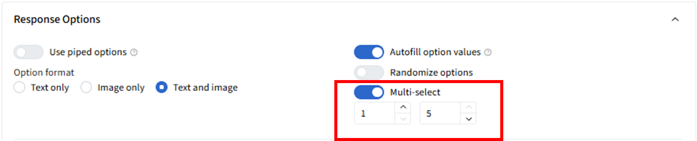 - To make the question (or each card) a multiple choice, toggle on Multi-select, and using the drop down, you can select (or type in) the least number of allowed responses (left) and the maximum number of (right) allowed responses.